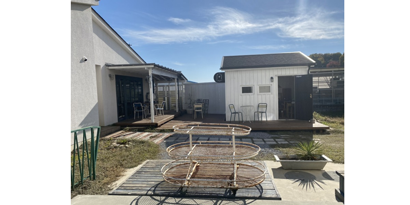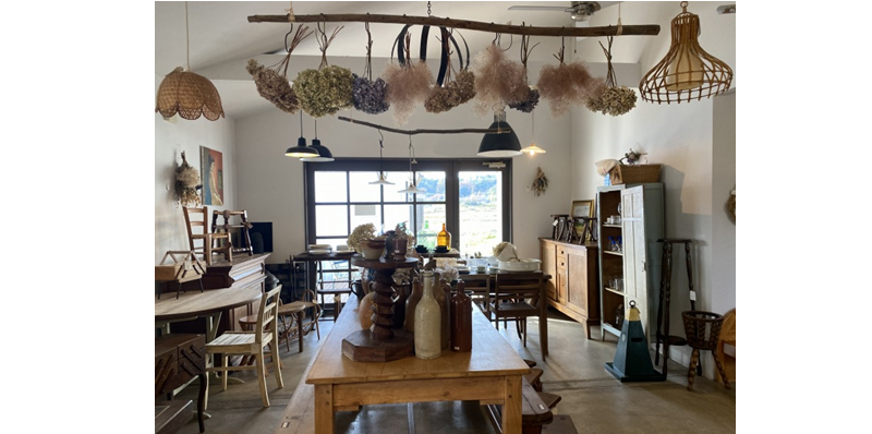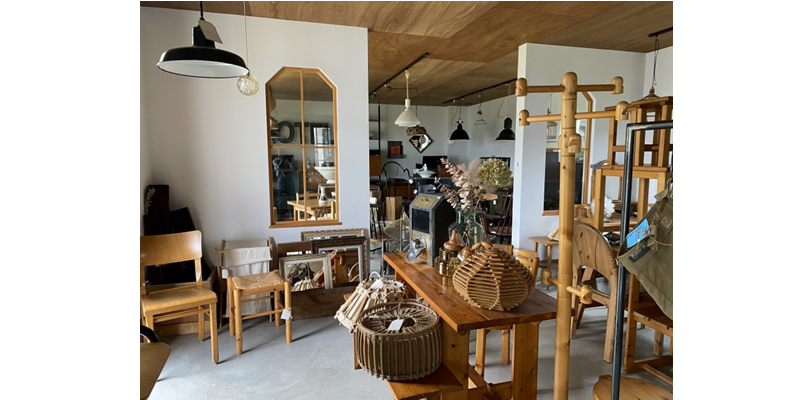 のどかな場所にあるインテリアショップです。外観は海外の一軒家のようなとてもかわいい雰囲気です。